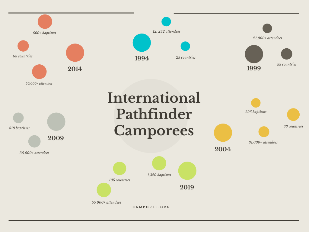 The International Camporee began in 1985 as the first North American Division Camporee. Since then it has grown to become a life-changing event for over 60,000 people from 100+ countries around the world.